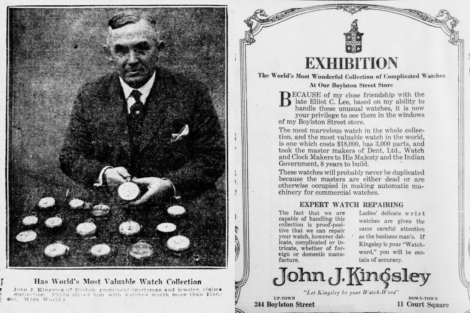 Most of what we know of the collection comes from John J. Kingsley of Boston, a watch retailer, watchmaker and friend, to whom Lee entrusted his collection. Both men were AAA members, and Kingsley aided Lee in planning his commissions. Kingsley kept the collection on display in his Boylston Street store for a time in 1924 according to an advertisement in The Boston Traveler newspaper and brought a selection of Lee’s watches from Massachusetts to James Ward Packard’s home in Ohio for his private viewing, as mentioned by Stacy Perman in A Grand Complication, a book about the ostensible rivalry between Graves and Packard.