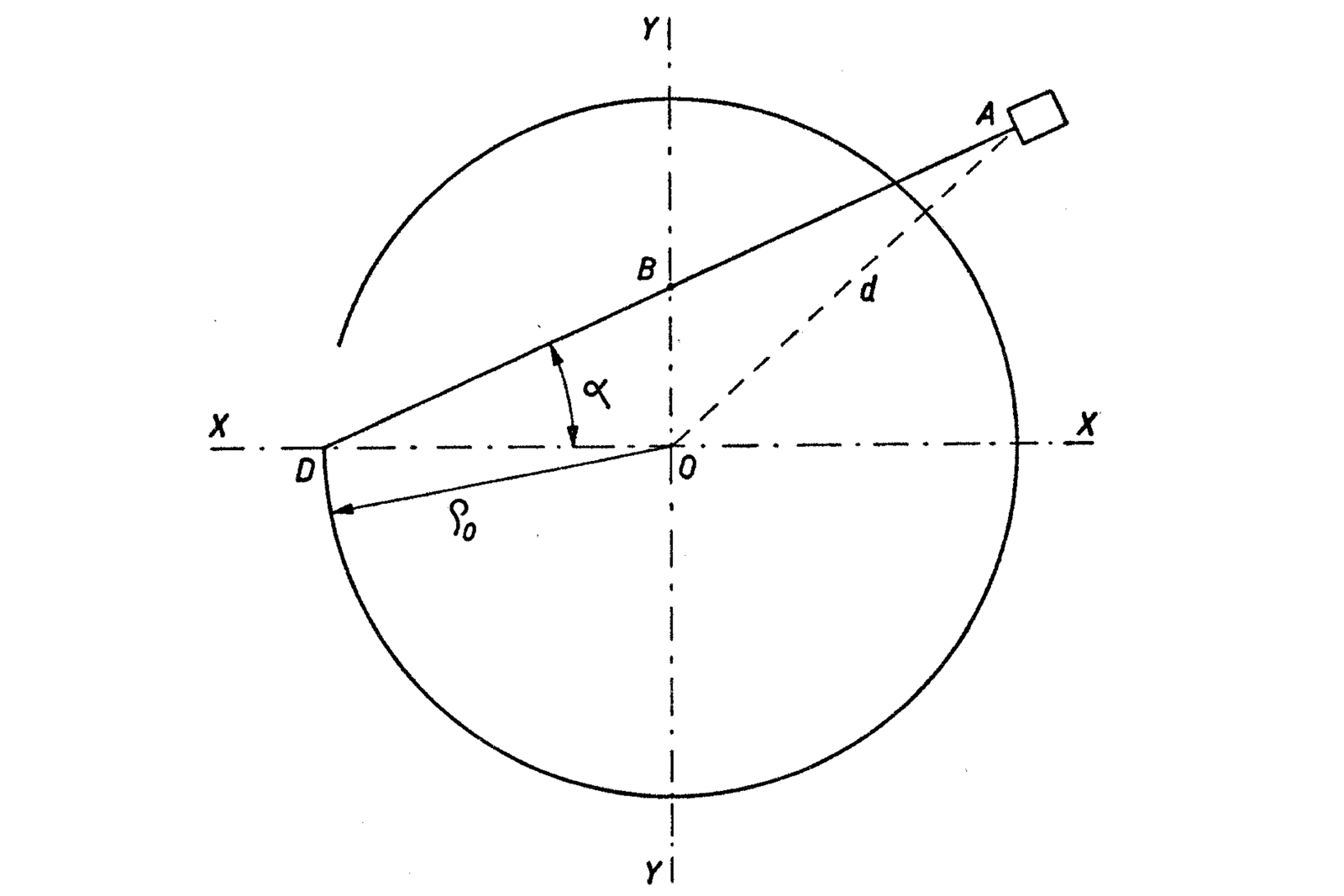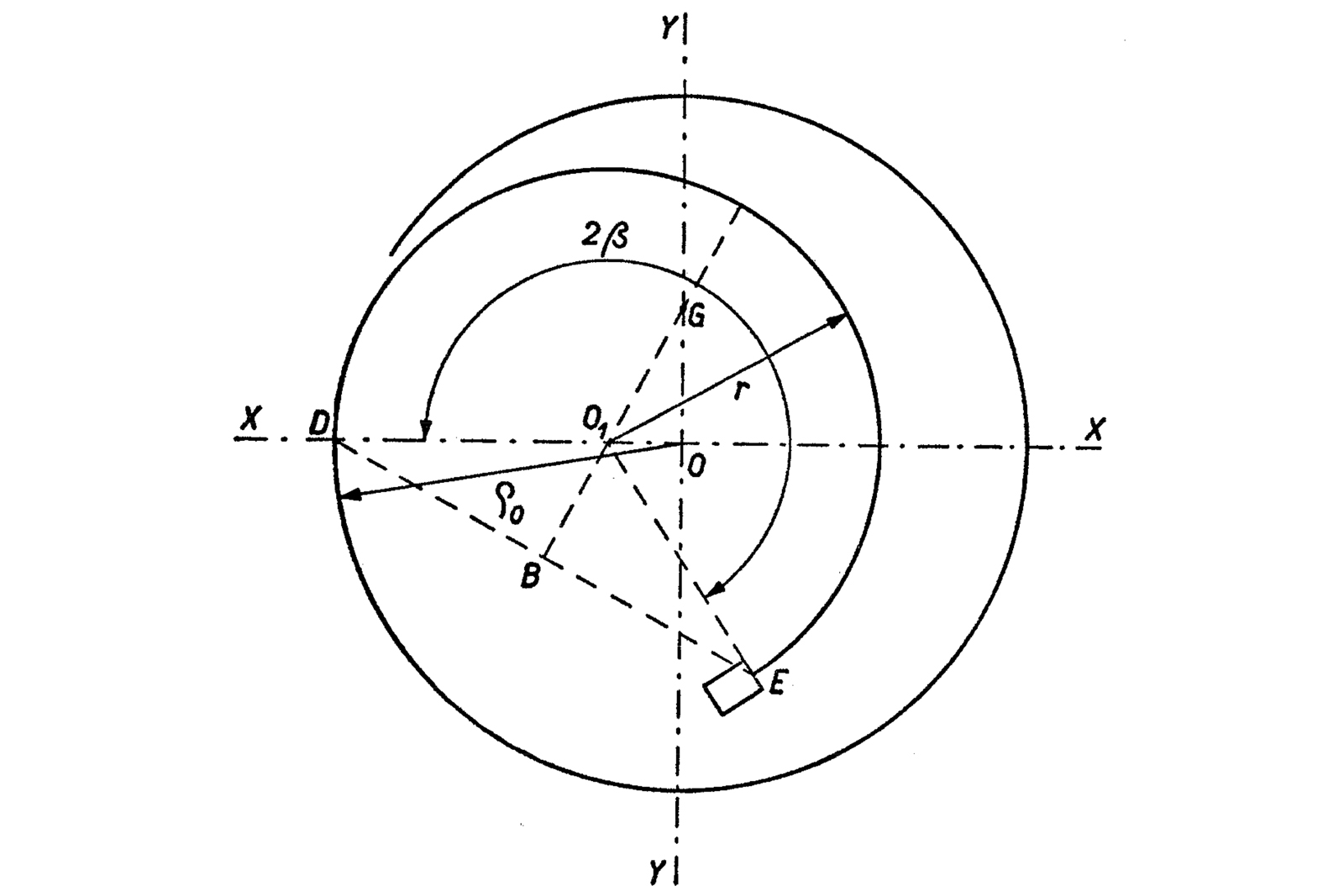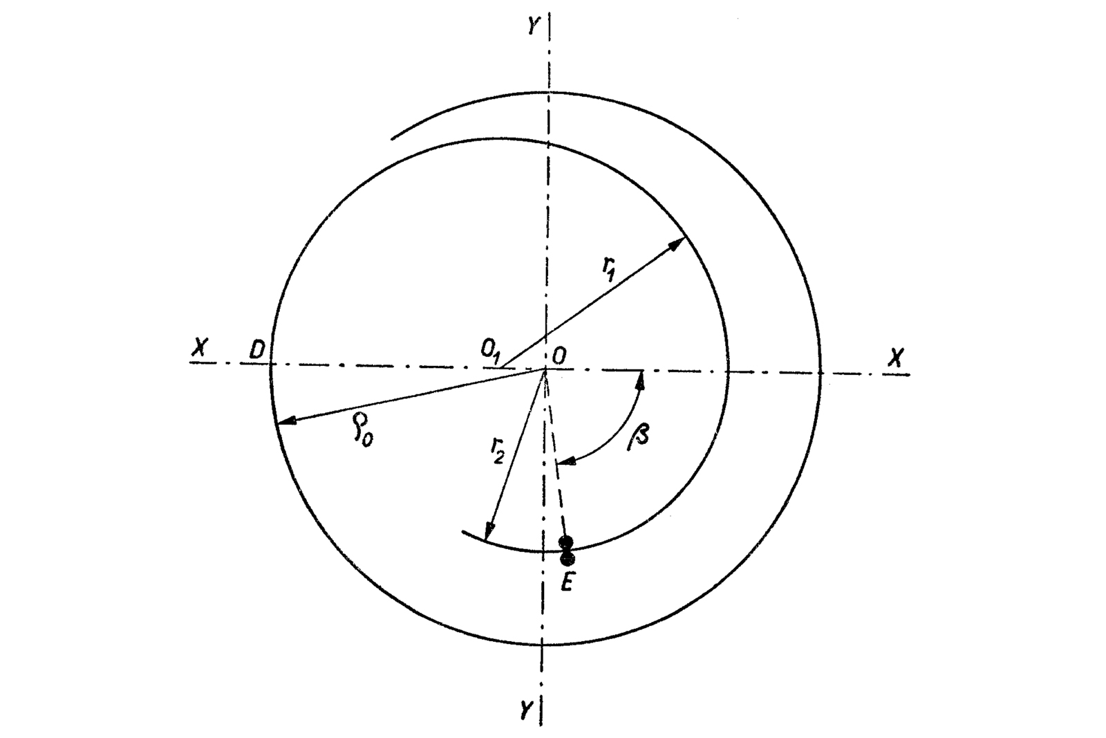 The concept might seem complicated but is straightforward enough to implement in real hairsprings. The figure below may be more suggestive for grasping the proportions. The starting point of the overcoil A is coincident with axis Ox. The gravity centre G of the end curve sits perpendicular to that axis, on Oy.